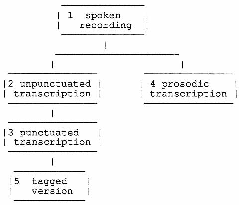 The unpunctuated transcriptions and the prosodic transcriptions were produced using the spoken recordings; the punctuated transcriptions were produced from the unpunctuated transcriptions; and the tagged versions were produced using the punctuated transcriptions. Versions 1, 2, 3, and 4 are produced manually; version 5 is produced semiautomatically. The following sections give details of the different versions.
